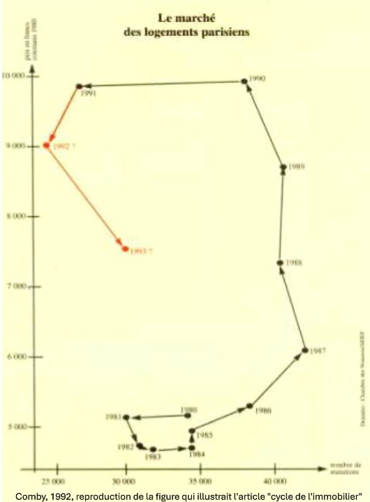 Joseph Comby a aussi beaucoup écrit sur les dynamiques des marchés dans le temps long, avec une attention particulière à l’analyse des cycles. On se souviendra à ce titre que le premier article « long » qu’il a publié dans le numéro 3 d’Etudes foncières était consacré à la dynamique des prix des terres agricoles. Mais ce sont ses analyses de la crise très violente subie par le marché immobilier parisien au début des années 1990 qui ont davantage marqué les esprits. Des questions majeures se posaient alors (et restent d’actualité !) : comment expliquer la crise ? Quand le marché va-t-il repartir ? Puis, lors de la reprise à la fin des années 1990, comment anticiper un nouveau retournement ? Joseph a contribué à ce débat à travers une courbe originale qui, en croisant prix et volumes, offrait à la fois une illustration du cycle et une analyse de la crise : ce sont les volumes qui précèdent la dynamique des prix.