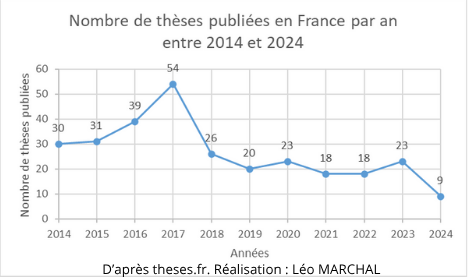 Au cours de cette décennie 2014-2024, 292 thèses ont été recensées. Elles ont été soutenues au sein des universités publiques, des établissements publics nationaux à caractère scientifique culturel et professionnel (comme l’École nationale des ponts et chaussées) et des établissements publics de coopération (comme les Agrocampus).