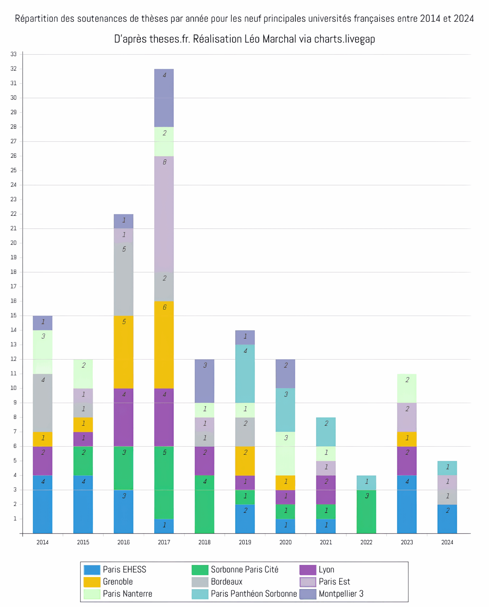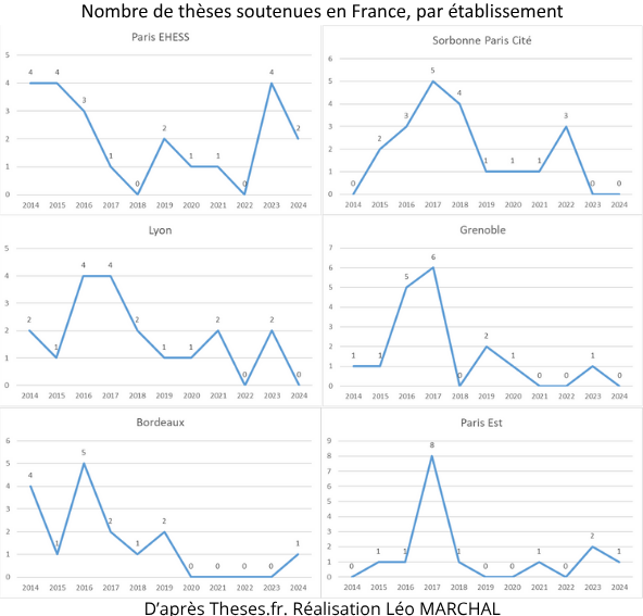 Dans d’autres universités, le pic durant cette décennie a pu intervenir au cours d’une autre année : EHESS a fait soutenir de plus nombreuses thèses en 2014-2015 et en 2023 (4 thèses, contre 1 en 2017), Bordeaux en 2014 et 2016 (respectivement 4 et 5, contre 2 en 2017), Panthéon-Sorbonne (pas de soutenance de thèse avant 2019, année où 4 thèses ont été soutenues). Le graphique suivant présente les soutenances de thèses par année et par établissement, pour les neuf universités ayant eu le plus de soutenances.