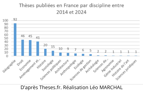 Quatre disciplines se distinguent : géographie (92), droit (46), économie (45) et aménagement et urbanisme (41). Environ un tiers des thèses soutenues l’ont été en géographie. Cette discipline est citée deux fois plus souvent que la discipline suivante la plus importante, à savoir le droit (droit public et droit privé). Toutes les autres disciplines ont moins de 20 thèses soutenues et un tiers de l’ensemble a moins de 2 thèses soutenues durant la décennie. Quatre disciplines n’ont au cours de la décennie qu’une seule thèse soutenue.