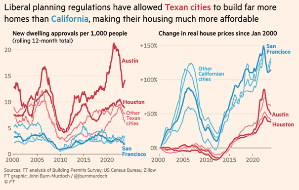 Ce constat est, semble-t-il involontairement, confirmé par le seul exemple mis en avant par la tribune publiée par Les Echos, celui d’Austin au Texas, présenté comme un « laboratoire » du mouvement Yimby[41]. Austin est effectivement emblématique des villes où l’on construit beaucoup et où les prix sont relativement bas (même s’ils montent). Un graphique évocateur a été publié en 2024 dans le Financial Times. L’opposition entre la Californie et le Texas est nette.